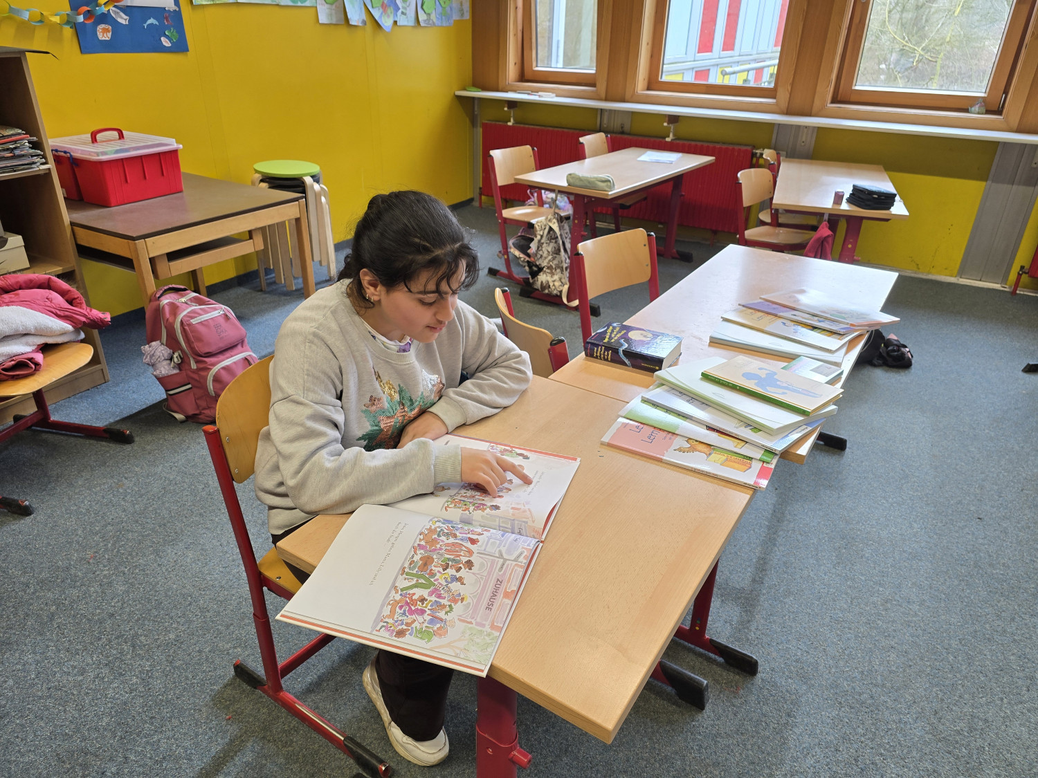 Lesekind Sara und Lesementorin Frau Hache beim gemeinsamen Lesen